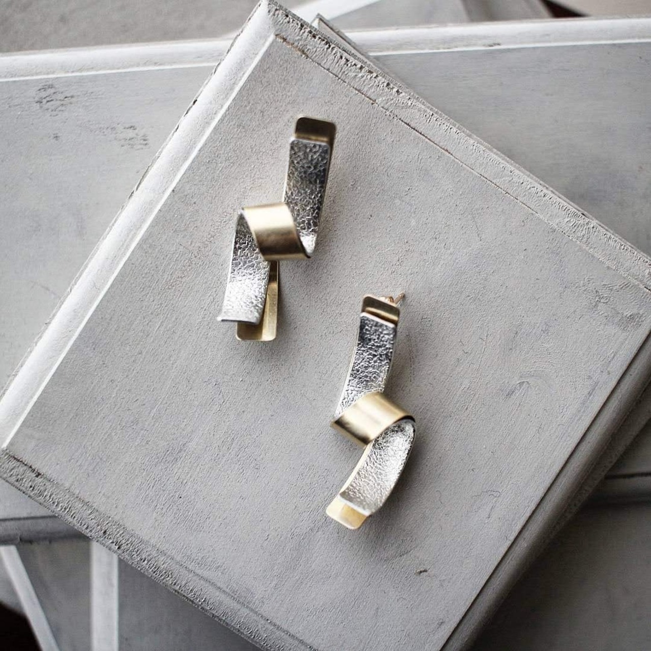 真鍮のリボンとレザーのような鎚目を施したスズのリボンを重ねてくるり。シンプルながら素材の美しさが際立つピアス。