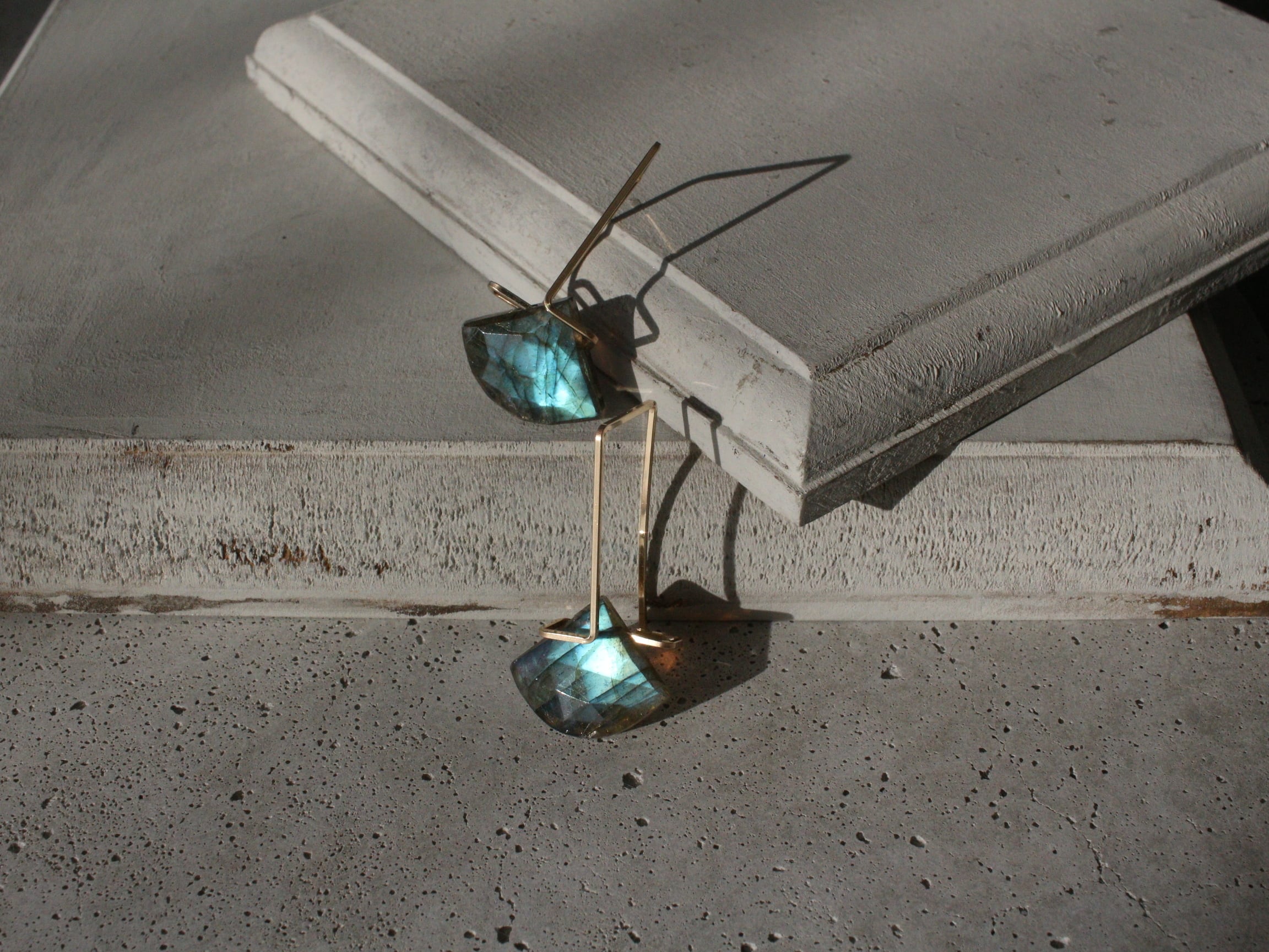 ピアスフックはデザインを兼ねた端正なラインを描き、ラブラドライト特有のミステリアスなシラーが揺れるほどに煌めきます。
